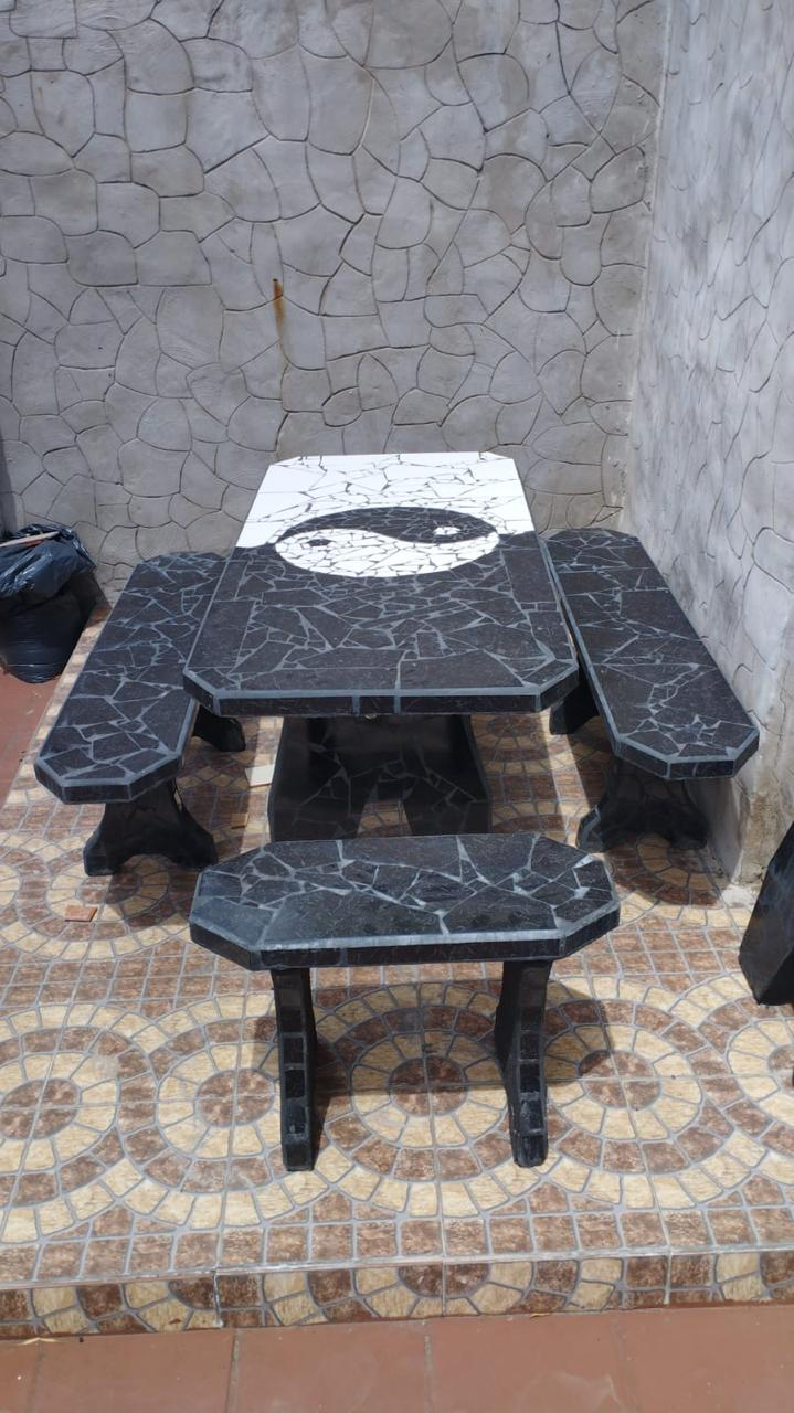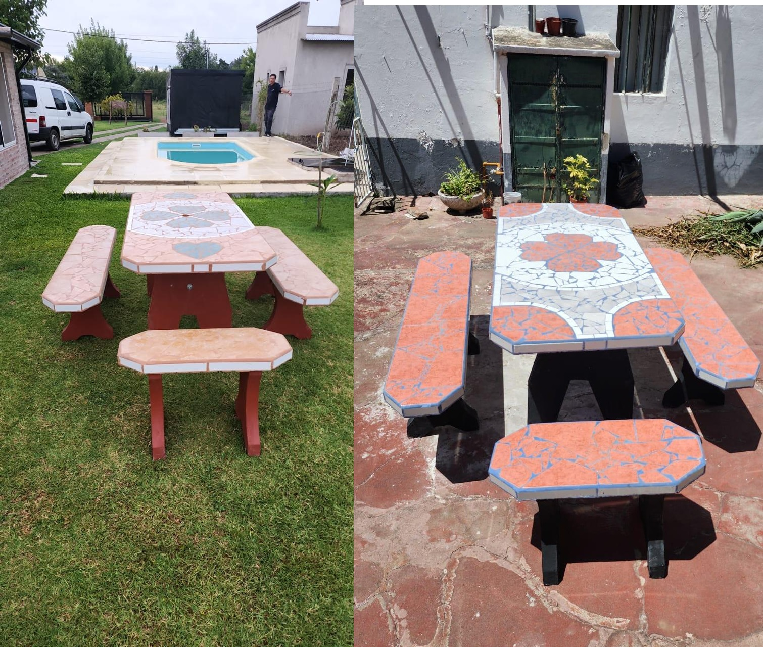2 bancos dobles de hormigón con hierros, revestidos en cerámicos